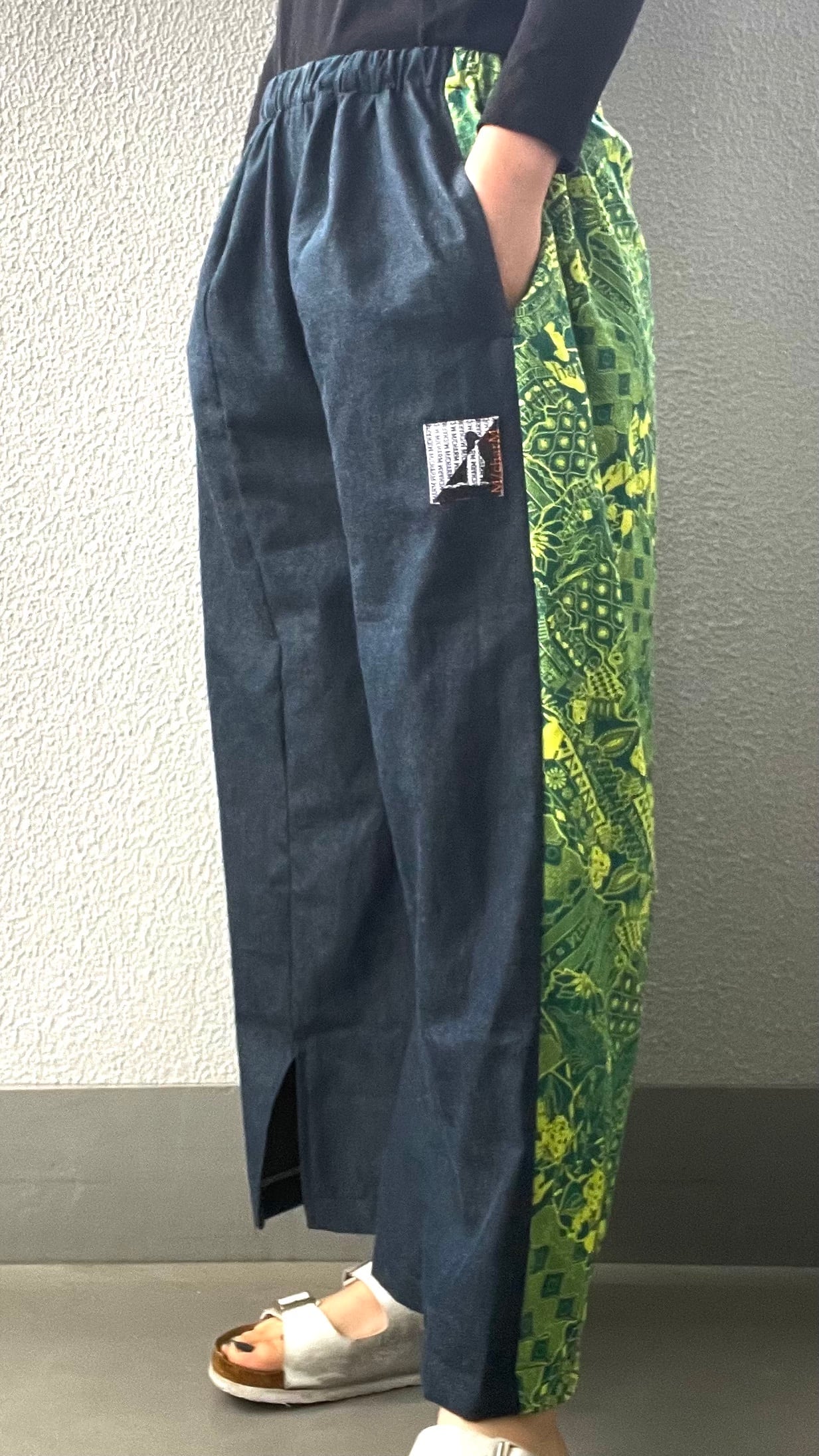 M/charM レディース異素材切り替え ワイドパンツ(Green)